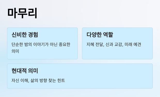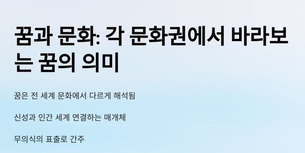 각 문화권에서 꿈은 단순한 밤의 이야기가 아닌, 중요한 의미를 가진 신비한 경험으로 여겨졌습니다. 꿈은 사람들에게 지혜를 전달하고, 신과의 교감을 가능하게 하며, 미래를 예견하는 중요한 수단으로 사용되었습니다. 현대에 들어서 꿈은 심리학적인 해석이나 무의식의 발현으로 여겨지기도 하지만, 각 문화에서 꿈이 지닌 의미와 가치는 여전히 중요한 역할을 합니다. 꿈을 통해 우리는 자신을 이해하고, 삶의 방향을 찾아가는 중요한 힌트를 얻을 수 있습니다.