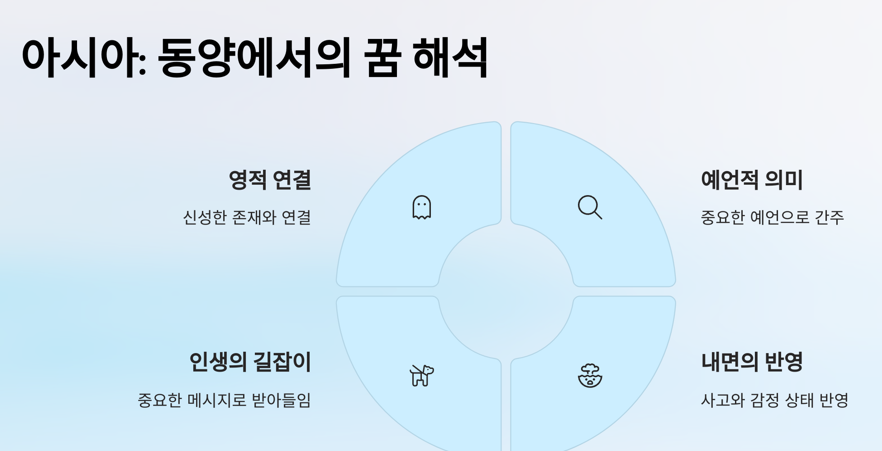 동양에서 꿈은 신성한 존재나 영적인 세계와의 연결로 해석되기도 했습니다. 특히 우리나라와 중국, 일본에서는 꿈을 중요한 예언으로 간주하는 경우가 많았습니다. 동양의 전통적인 꿈 해석에서는 '사고(思考)'와 '감정(感情)'의 상태를 반영하는 것으로 여겨졌으며, 꿈은 인생의 길잡이가 될 수 있는 중요한 메시지로 받아들여졌습니다.