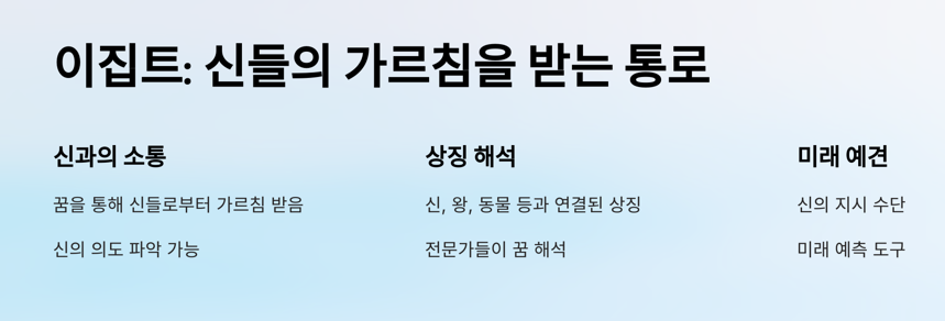 고대 이집트에서도 꿈은 신과의 소통의 통로로 중요하게 여겨졌습니다. 이집트인들은 꿈을 통해 신들로부터 가르침을 받거나, 신의 의도를 알 수 있다고 믿었습니다. 꿈의 상징은 종종 신이나 왕, 동물 등과 연결되었으며, 이집트 문명에서는 꿈을 해석하는 전문가들이 존재했습니다. 이들은 꿈에서 나온 상징들을 분석하고, 그 의미를 풀어내는 역할을 했습니다.