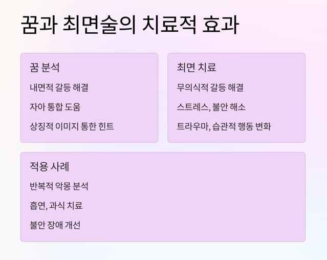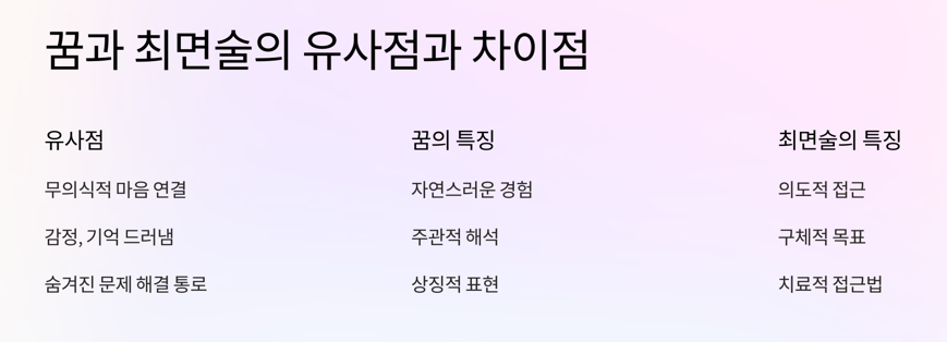 꿈과 최면술은 모두 무의식적인 마음과 연결되어 있다는 점에서 매우 유사합니다. 둘 다 우리가 의식적으로 인식하지 못하는 감정이나 기억을 드러내는 방법이며, 무의식 속에 숨겨진 문제를 해결할 수 있는 중요한 통로가 됩니다. 그러나 이 두 가지는 접근 방식에서 큰 차이를 보입니다.