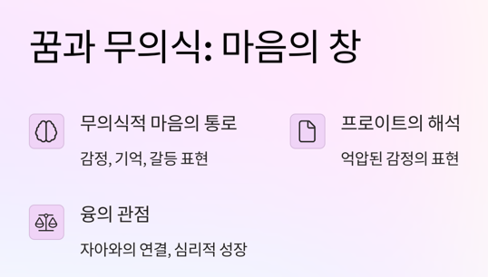 - 꿈은 자연스럽게 우리가 잠을 자는 동안에 경험하는 것이며, 이때의 무의식은 우리가 스스로 알지 못하는 감정이나 기억들이 자유롭게 떠오르는 방식입니다. 꿈을 해석하는 것은 우리의 내면을 이해하는 하나의 방법이지만, 그 해석은 종종 상징적이고, 다양한 해석이 가능하다는 점에서 주관적입니다.