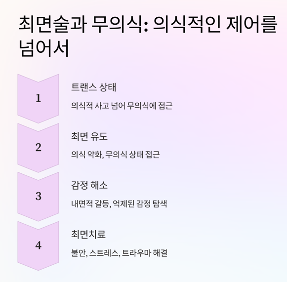 최면술은 사람이 의식적인 사고를 넘어서 무의식적인 상태에 들어가게 하는 기법입니다. 최면 상태에서 사람은 일종의 트랜스 상태에 빠져, 주변 환경에 대한 인식은 줄어들고, 무의식적인 마음과 더 가까운 상태로 접속됩니다. 이 상태에서 사람은 자신의 내면적 갈등이나 억제된 감정을 탐색하거나, 과거의 기억을 떠올리며 감정적 해소를 경험할 수 있습니다.