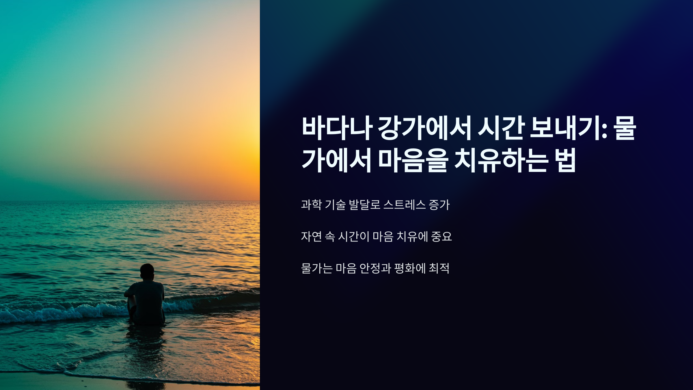 바다나 강가에서 보내는 시간은 단순한 휴식 이상의 의미를 가집니다. 물의 소리와 자연의 아름다움은 마음의 평화를 가져다주며, 몸과 마음을 동시에 치유할 수 있는 공간을 제공합니다. 바쁜 일상 속에서 잠시 멈추고 자연 속에서의 시간을 가지는 것만으로도 우리는 새로운 에너지를 얻고, 복잡한 생각들을 정리할 수 있습니다. 자연과의 교감을 통해 마음을 치유하고, 더 나은 삶을 위한 원동력을 얻어보세요. 물가에서의 소중한 시간을 통해 여러분도 마음의 평화를 찾고, 마음속의 상처를 치유할 수 있을 것입니다.
