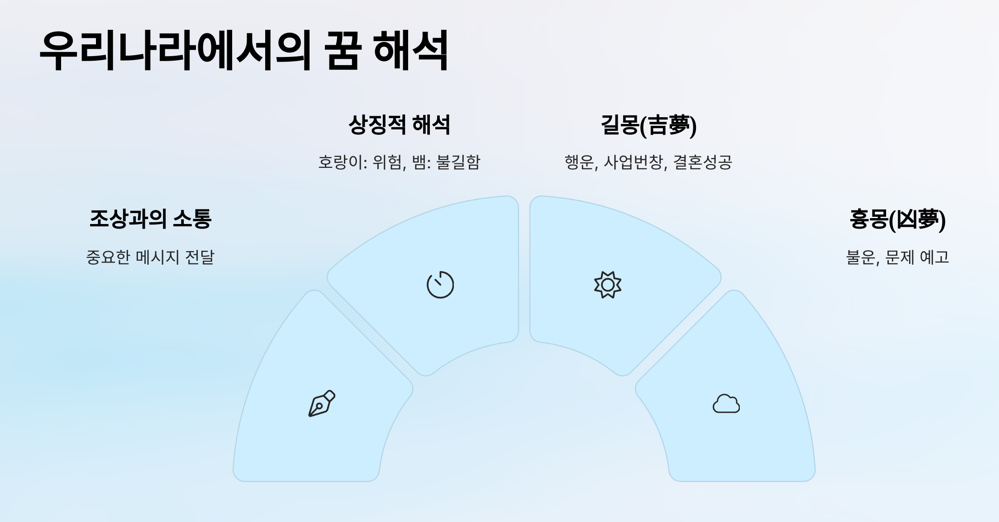 우리나라의 전통적인 꿈 해석에서 자주 등장하는 상징은 매우 구체적입니다. 예를 들어, **‘호랑이를 보는 꿈’**은 '위험이나 위기', **‘뱀을 보는 꿈’**은 ‘불길한 징조’로 해석되기도 합니다. 반면 **‘복권에 당첨되는 꿈’**이나 **‘음식을 먹는 꿈’**은 대체로 행운이나 재물의 증가를 의미한다고 해석됩니다. 또한 **‘죽은 사람이 나타나는 꿈’**은 그 사람이 살아 있을 때 해결하지 못했던 일이나, 중요한 메시지를 남기려는 의도로 풀이되기도 합니다.