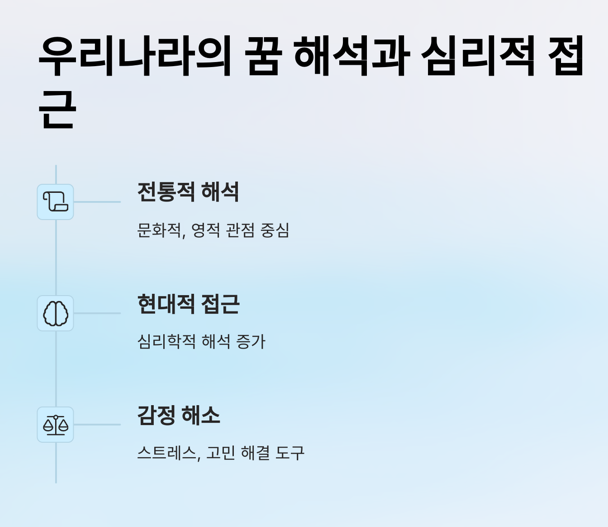 우리나라의 전통적인 꿈 해석은 주로 심리학적 관점보다는 문화적, 영적 관점에 더 많은 영향을 받았습니다. 그러나 최근 들어 심리학적 접근 방식도 함께 고려되기 시작하면서, 꿈을 단순한 무의식적 표현 이상의 것으로 해석하려는 시도가 늘고 있습니다. 예를 들어, 꿈에서 자주 나타나는 반복적인 이미지나 특정 인물이 심리적인 갈등이나 무의식적인 감정을 반영하는 방식으로 해석되기도 합니다.