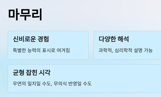 예지몽은 신비로운 경험이며, 많은 사람들이 이를 신비적으로 또는 특별한 능력의 표시로 여깁니다. 그러나 예지몽의 본질은 과학적으로나 심리학적으로 다양한 해석이 가능합니다. 꿈을 통해 미래의 사건을 미리 알게 된다는 경험은 흥미롭고 신기할 수 있지만, 그것이 단지 우연의 일치나 무의식적인 처리가 반영된 결과일 수도 있다는 점을 기억하는 것이 중요합니다. 예지몽을 경험했다고 해서 그것이 반드시 특별한 능력을 의미하는 것은 아니며, 꿈과 현실 사이의 신비한 연결 고리를 이해하는 데는 여러 가지 관점이 존재합니다.