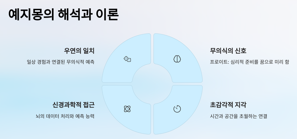 프로이트의 정신분석학 이론에 따르면, 꿈은 무의식의 발현이기 때문에 꿈속에서의 상징이나 이미지는 우리가 무의식적으로 처리하고 있는 감정이나 갈등을 나타냅니다. 이 관점에서 볼 때, 예지몽은 사실 우리가 경험할 수 있는 사건에 대한 심리적 준비를 꿈을 통해 미리 하는 것일 수 있습니다. 무의식이 다가오는 사건에 대해 이미 어느 정도 감지하고 있다는 주장입니다.