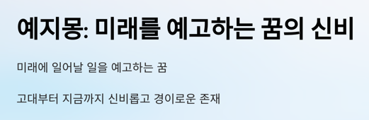예지몽(預知夢)은 미래에 일어날 일을 예고하는 꿈으로, 꿈에서 본 내용이 실제로 현실에서 일어나는 현상을 말합니다. 예를 들어, 꿈에서 본 숫자가 로또에 당첨되는 번호와 일치하거나, 가까운 미래에 일어날 중요한 사건을 꿈에서 미리 보는 경험입니다. 예지몽은 단순한 우연의 일치일 수도 있지만, 많은 사람들이 그것을 단순히 우연으로 설명할 수 없다고 믿습니다.