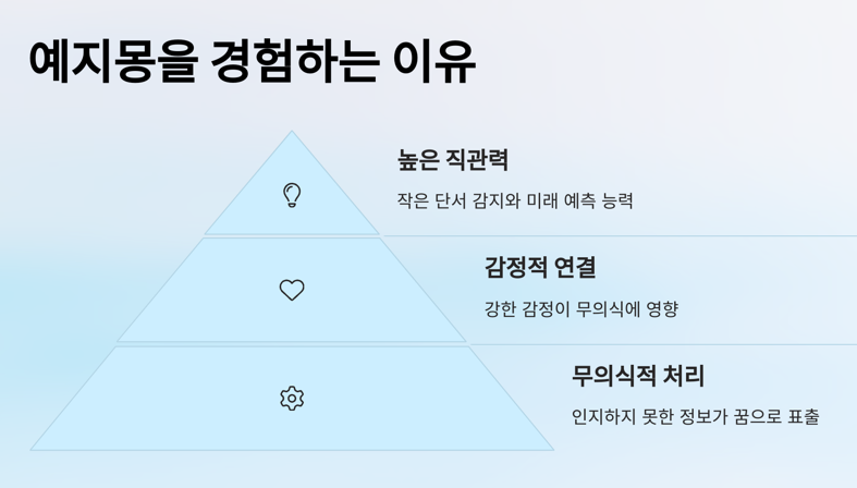 왜 어떤 사람들은 예지몽을 자주 경험할까요? 예지몽을 경험하는 사람들은 그 자체가 특별한 능력 때문이라고 주장하는 경우도 많습니다. 그러나 심리학적으로는 예지몽이 일어날 수 있는 몇 가지 이유가 있습니다.
