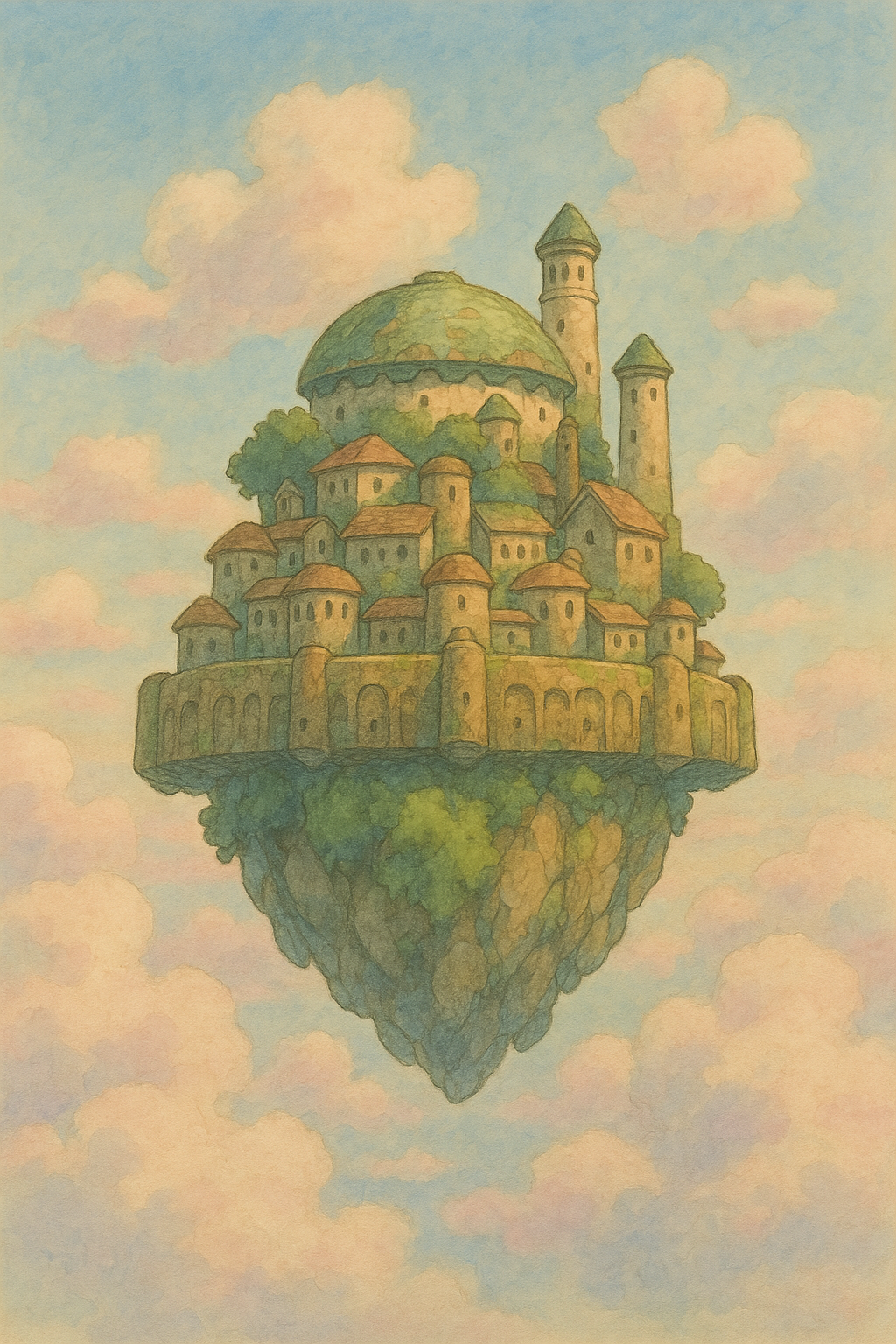 - A flying castle above the clouds, inspired by Ghibli, pastel tones