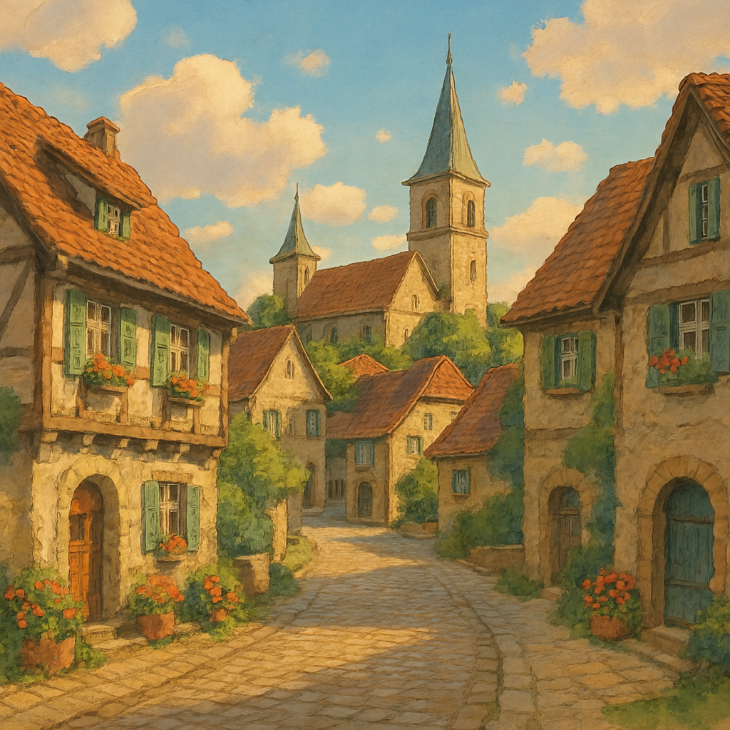 지브리 스타일의 작은 유럽 마을, 따뜻한 햇살과 부드러운 구름, 포근한 분위기