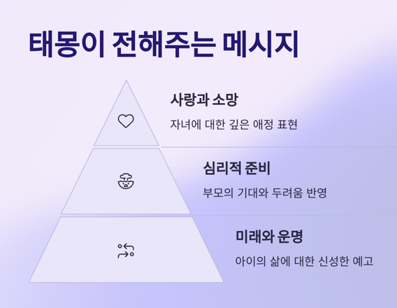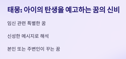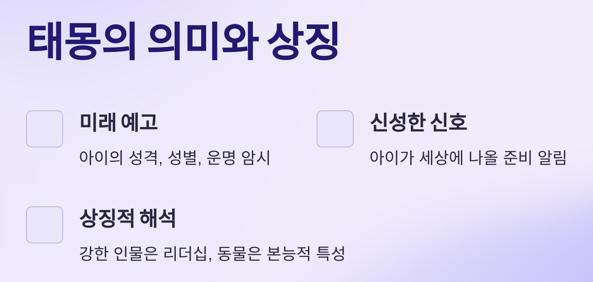 태몽은 미래의 아이를 예고하는 꿈으로, 아이의 성격이나 성별, 운명과 관련된 중요한 메시지를 담고 있다고 믿어집니다. 이 꿈은 단순히 아이의 탄생을 예고하는 것이 아니라, 아이가 세상에 나올 준비가 되었음을 알리는 신성한 신호로 여겨졌습니다. 꿈에서 아이가 태어날 때의 모습이나 환경, 또는 꿈 속에서 일어나는 특별한 사건들이 아이의 성격이나 운명과 연결되는 것으로 해석될 수 있습니다.