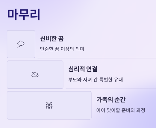 태몽은 단순한 꿈을 넘어, 부모와 자녀 사이의 깊은 심리적 연결과 예언적 메시지를 담고 있는 신비한 존재입니다. 꿈에서 등장하는 다양한 상징들은 아이의 성격, 운명, 그리고 부모의 기대와 염려를 반영하며, 이를 통해 부모는 자녀에 대한 사랑과 희망을 더욱 깊이 느낄 수 있습니다. 태몽을 꾸는 경험은 단순히 꿈을 넘어서, 부모가 아이를 맞이할 준비를 하는 중요한 심리적 과정이자, 가족 간의 특별한 연결을 의미하는 신비로운 순간입니다.