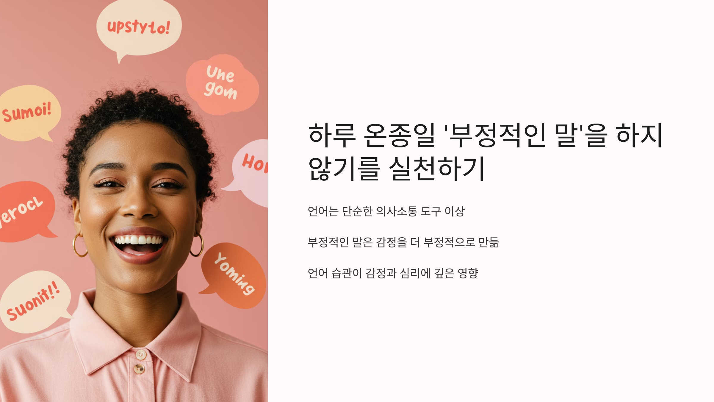 우리의 일상에서 사용하는 언어는 단순히 의사소통의 도구를 넘어서, 감정과 심리에 깊은 영향을 미칩니다. 특히 부정적인 말은 우리가 느끼는 감정을 더 부정적으로 만들 수 있습니다. 그렇다면 '하루 온종일 부정적인 말을 하지 않기'를 실천을 해본다면 어떤 변화가 일어날까요? 이 글에서는 언어가 감정에 미치는 영향과 하루 온종일 부정적인 말을 하지 않기를 실천 하는 것이 어떤 긍정적인 변화를 가져올 수 있는지에 대해 알아보겠습니다.