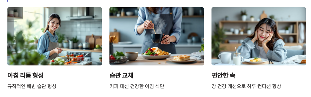 | 따뜻한 물 | 장 자극 및 수분 공급 | 기상 직후 1컵 추천 |