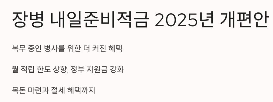 2025년 장병 내일준비적금은 단순한 저축이 아닌, **국가가 함께 만들어주는 자산 형성 시스템**입니다. 월 납입한도가 55만 원으로 상향되며, 전역 시 최대 1,500만 원 이상의 목돈 마련도 가능한 지금이 바로 가입 타이밍!