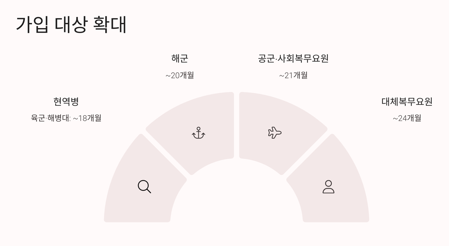 이제는 현역병 뿐만 아니라, **상근예비역**, **사회복무요원**, **대체복무요원**까지 포함됩니다. 병 급여 및 복무체계를 적용받는 인원이면 누구든 가입할 수 있어요. 복무기간별로 가입 가능한 기간도 다르므로 참고하세요.