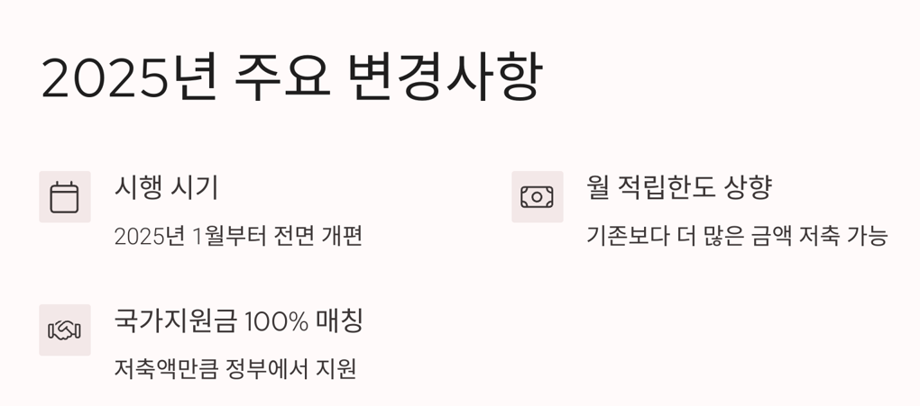 | 정부 매칭 지원금 | 적금 원금 기준 100% 지원 | 동일 |