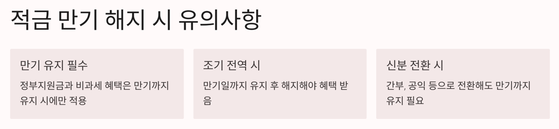 정부지원금과 비과세 혜택은 **만기까지 유지했을 때만 적용**됩니다. 조기 전역하거나 신분 전환(간부, 공익 등)하는 경우 반드시 만기일까지 유지 후 해지해야 혜택을 받을 수 있어요. 꼭 기억하세요!