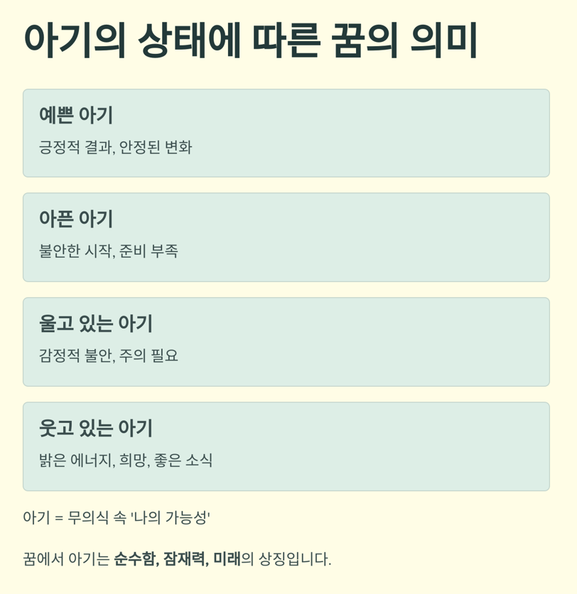 꿈에서 아기는 내가 마음속에 간직하고 있던 순수함, 잠재력, 미래의 상징입니다.